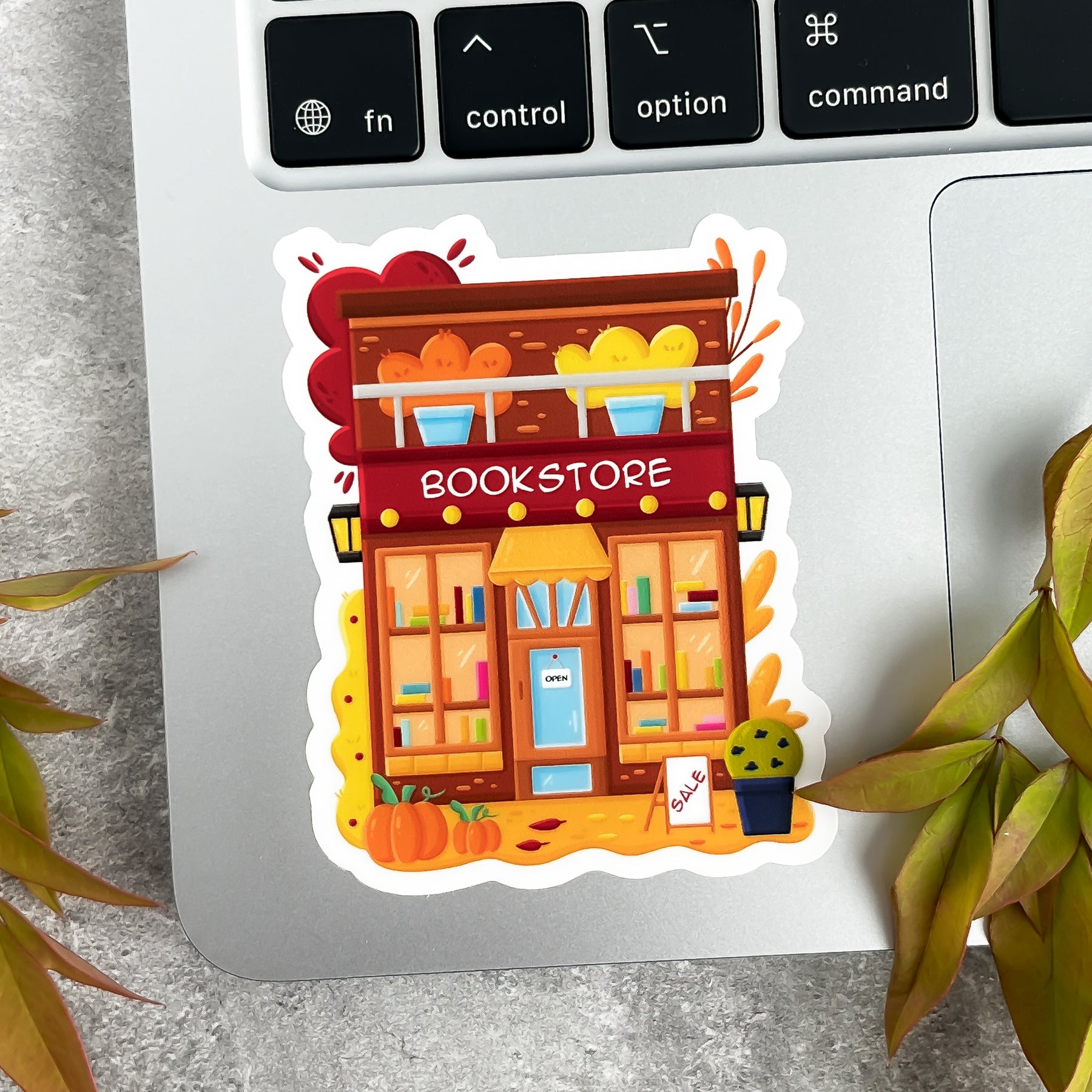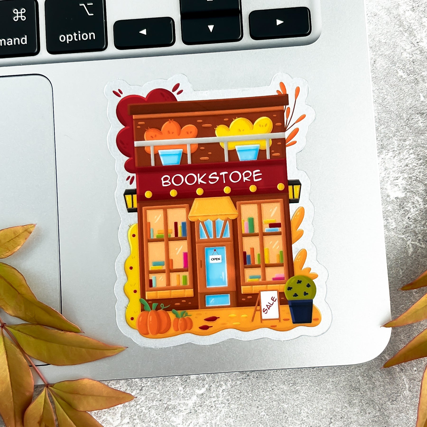 Fall bookstore vinyl sticker offered in classic white with white background and white border once the backing is removed, or clear sticker with a solid white backing, but is clear once the backing is removed. Can be used on mobile phones, water bottles, cups, binders, notebooks and more.
