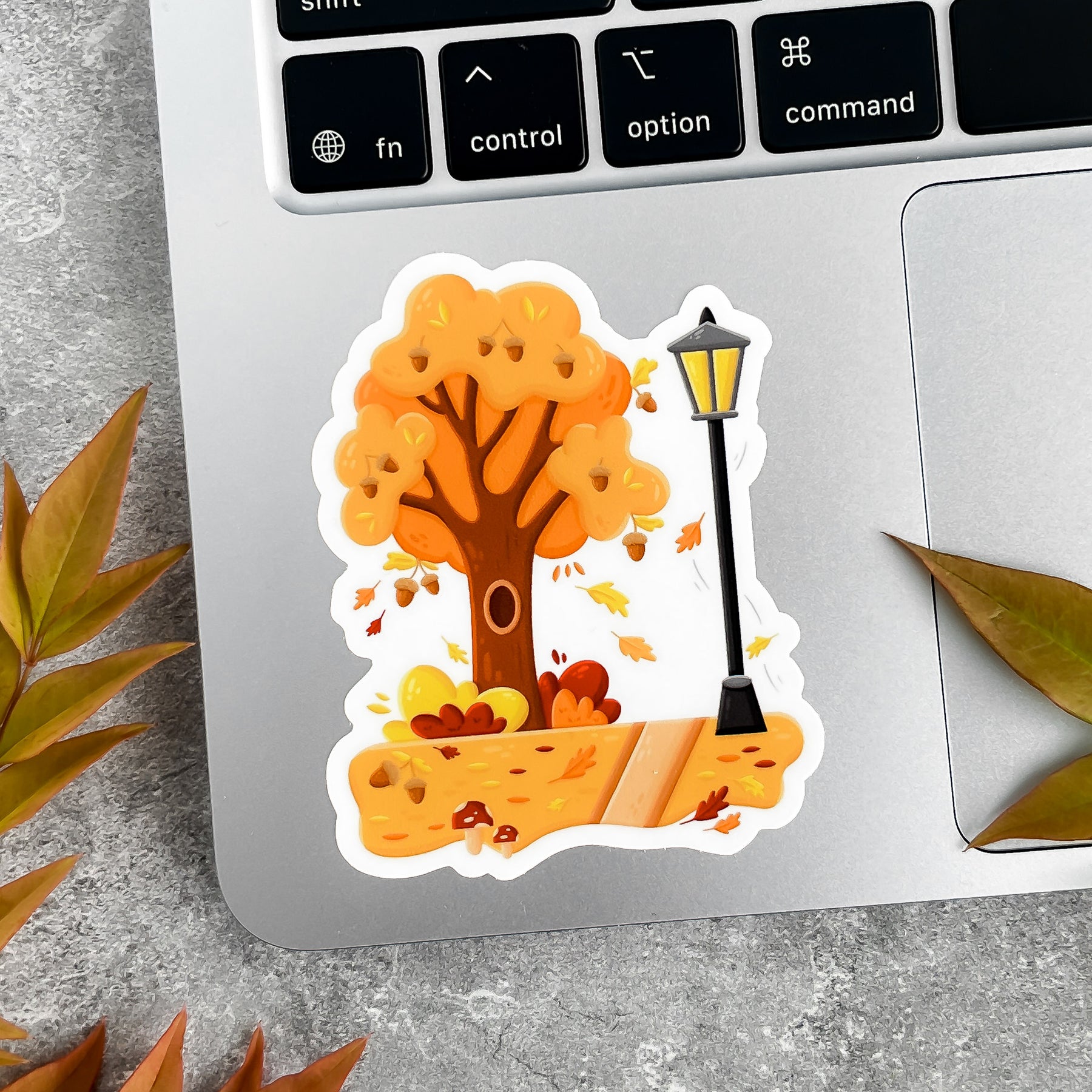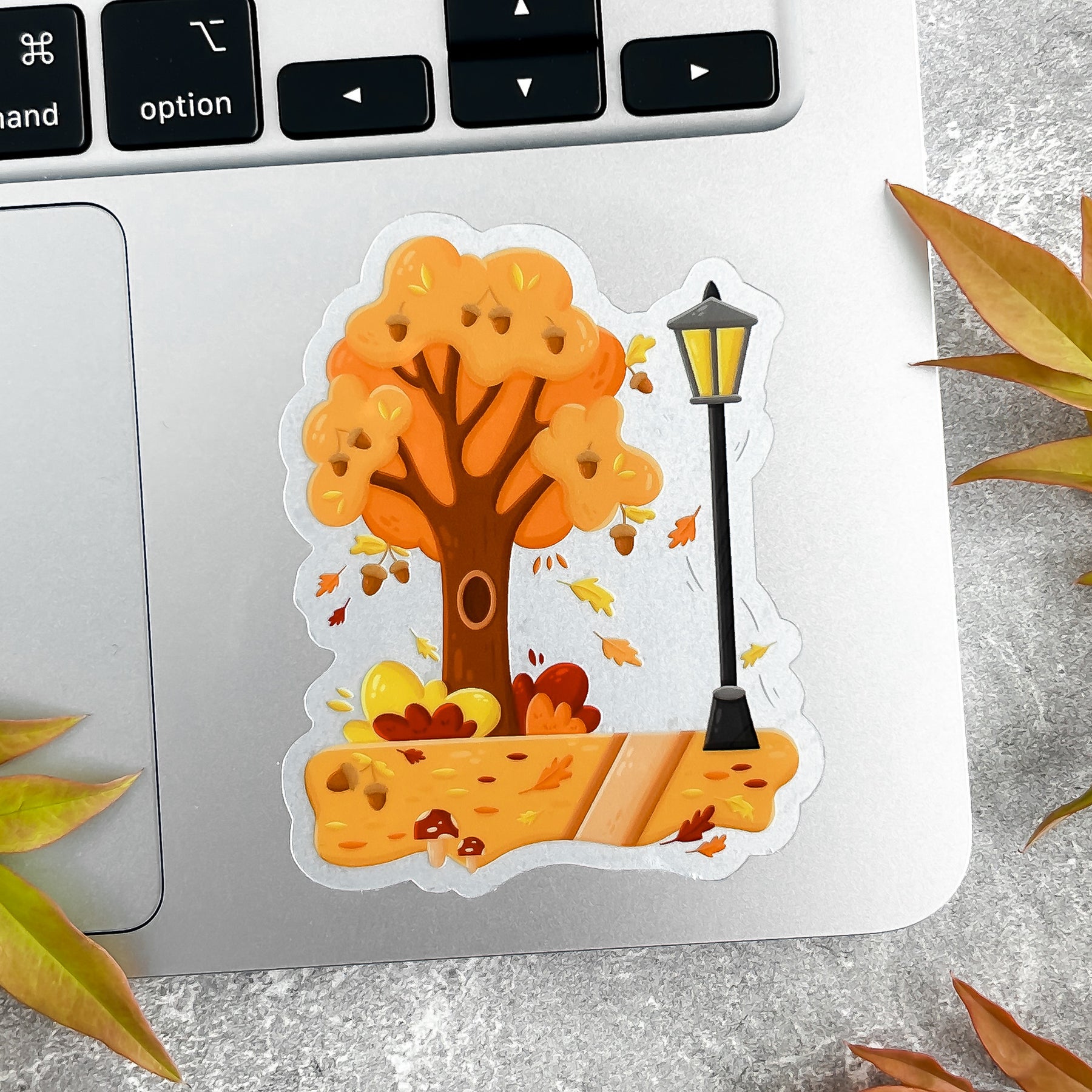 Autumn road vinyl sticker offered in classic white with white background and white border once the backing is removed, or clear sticker with a solid white backing, but is clear once the backing is removed. Can be used on mobile phones, water bottles, cups, binders, notebooks and more.