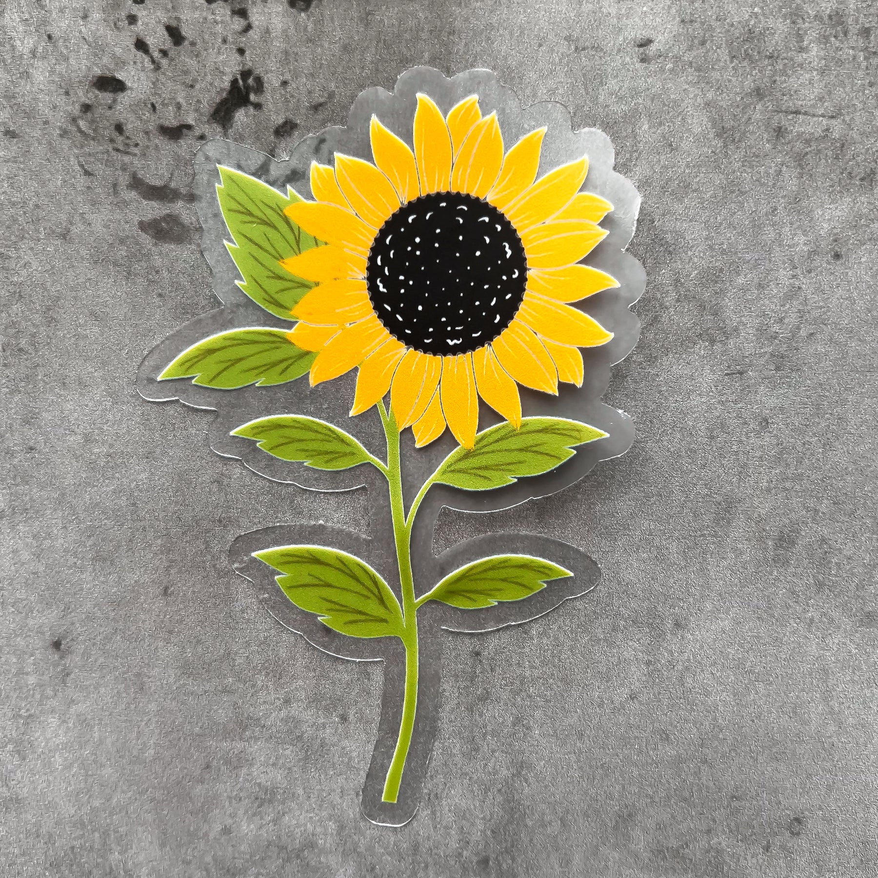 Sunflower clear vinyl sticker comes with a solid white backing, but is clear once the backing is removed. Can be used on water bottles, cups, binders, notebooks and more.