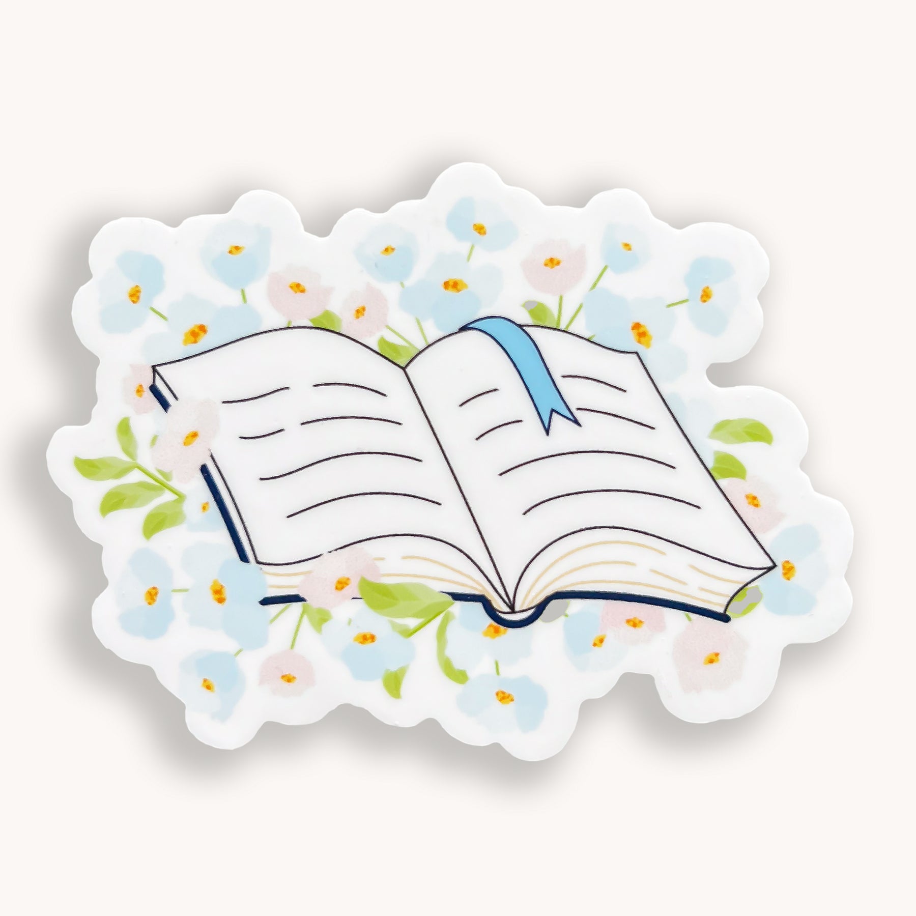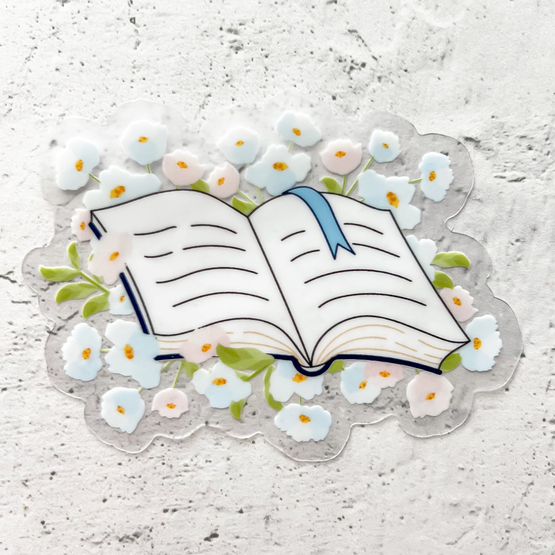 Floral book clear vinyl sticker comes with a solid white backing, but is clear once the backing is removed. Can be used on water bottles, cars, Bibles, notebooks and more.