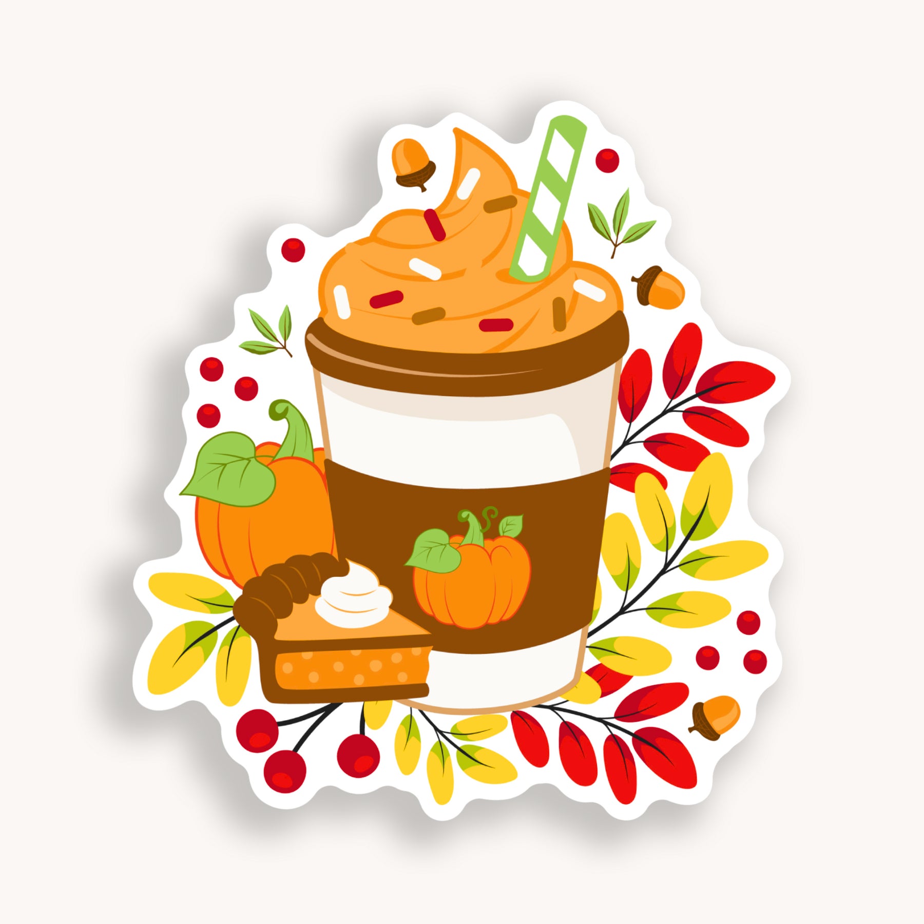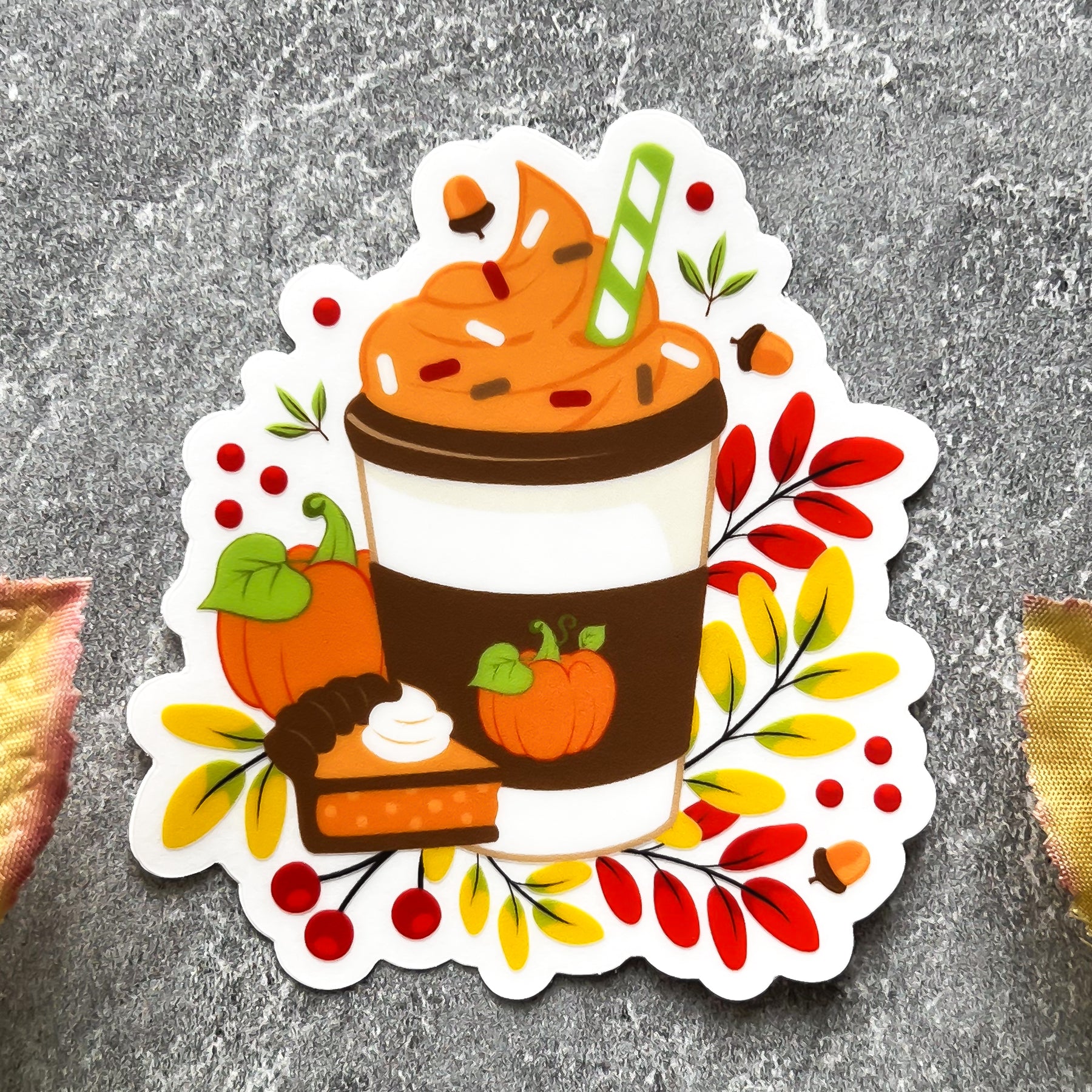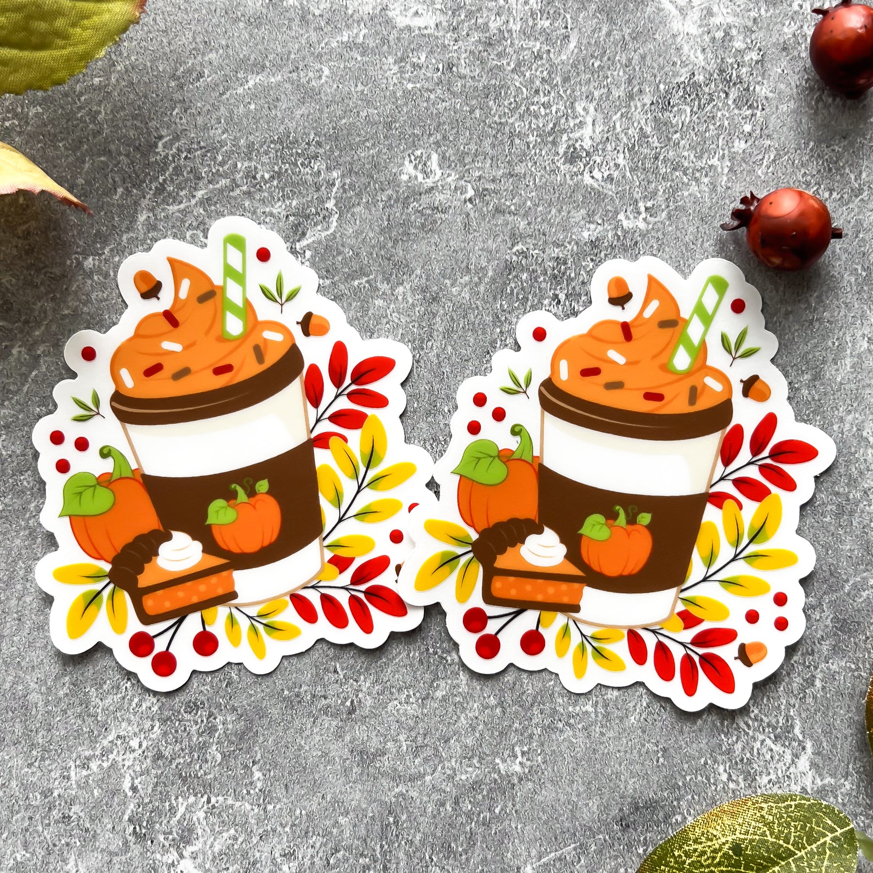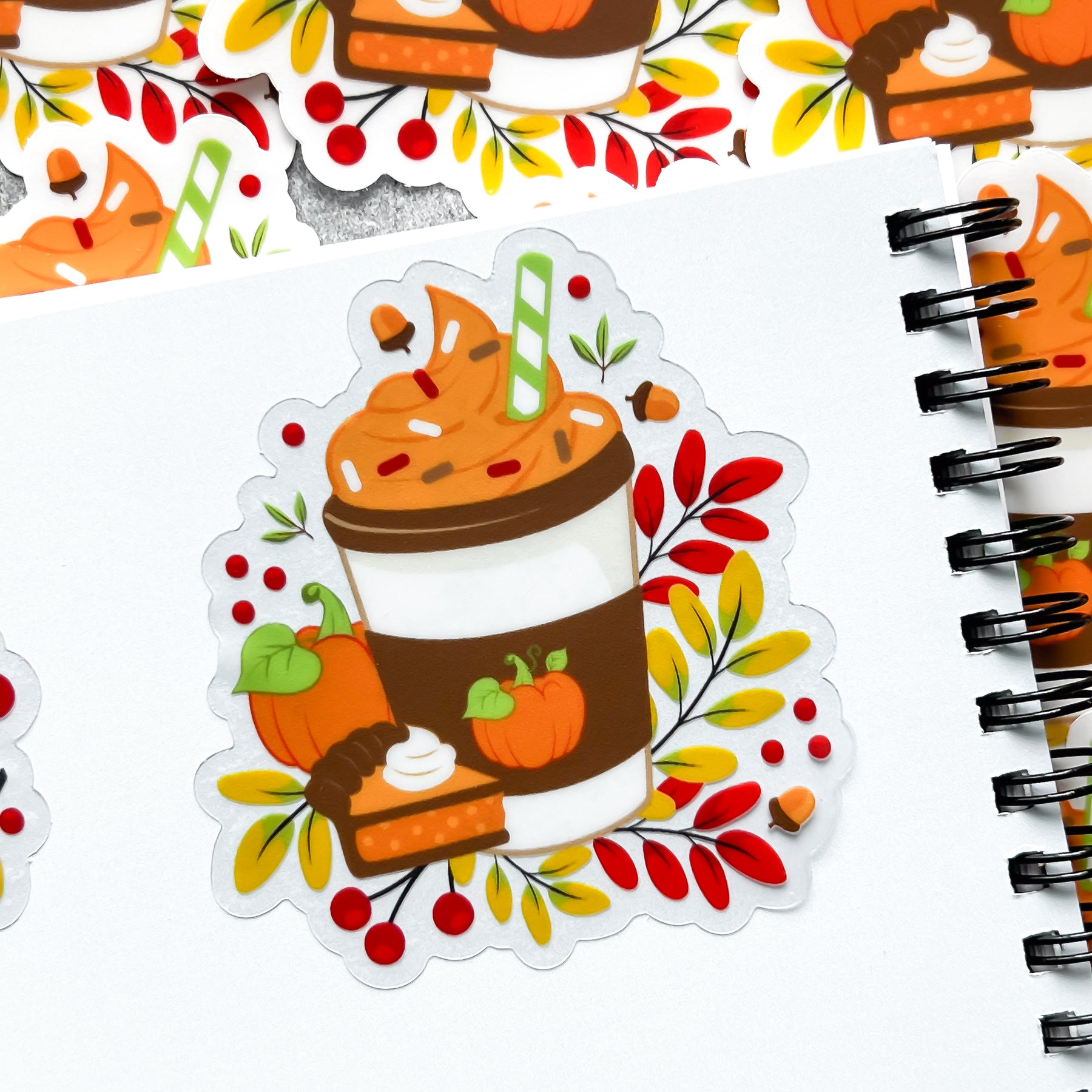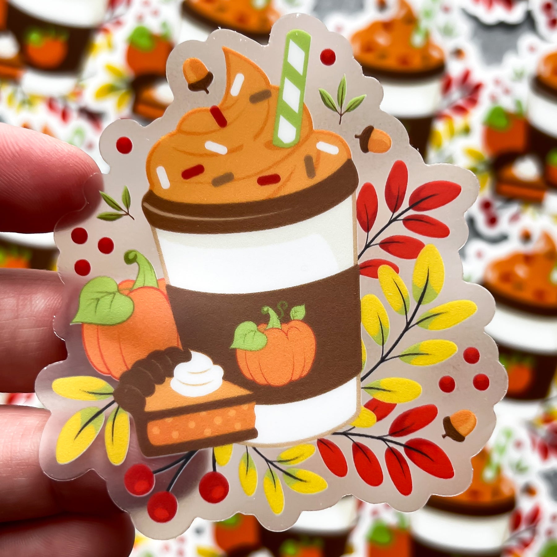 Clear fall coffee with pumpkin pie vinyl sticker comes with a solid white backing, but is clear once the backing is removed. Can be used on mobile phones, water bottles, cups, binders, notebooks and more.