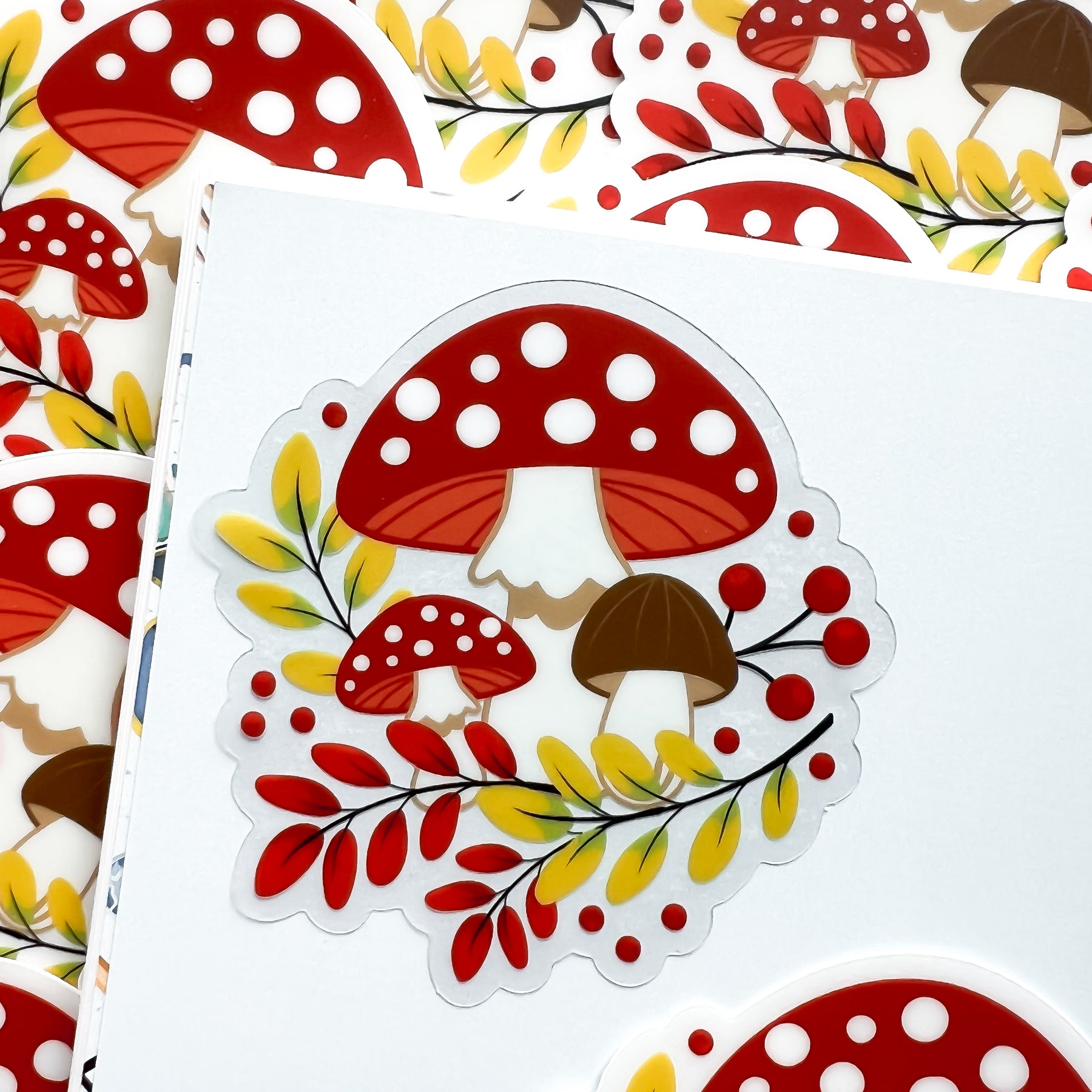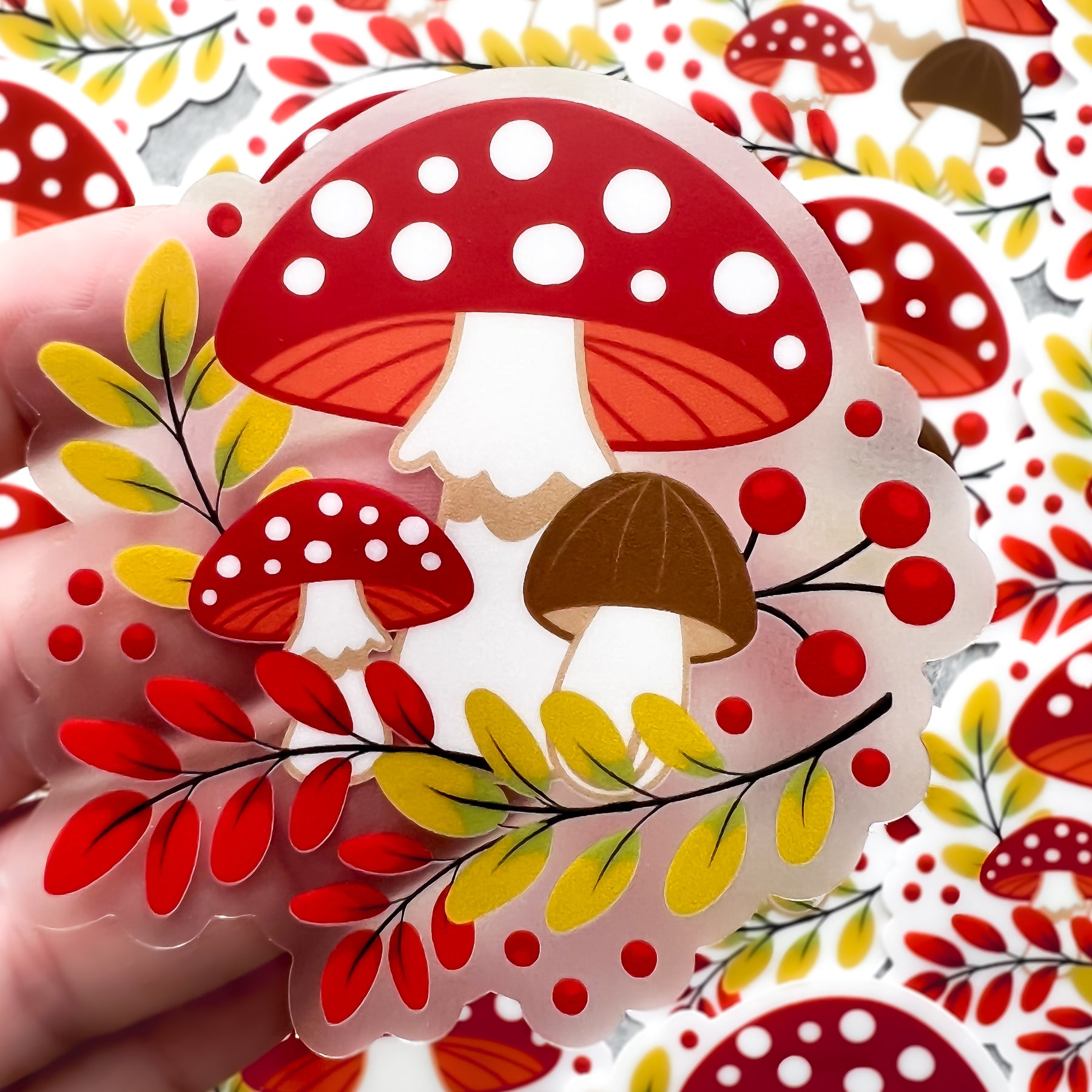 Clear fall mushrooms vinyl sticker comes with a solid white backing, but is clear once the backing is removed. Can be used on mobile phones, water bottles, cups, binders, notebooks and more.