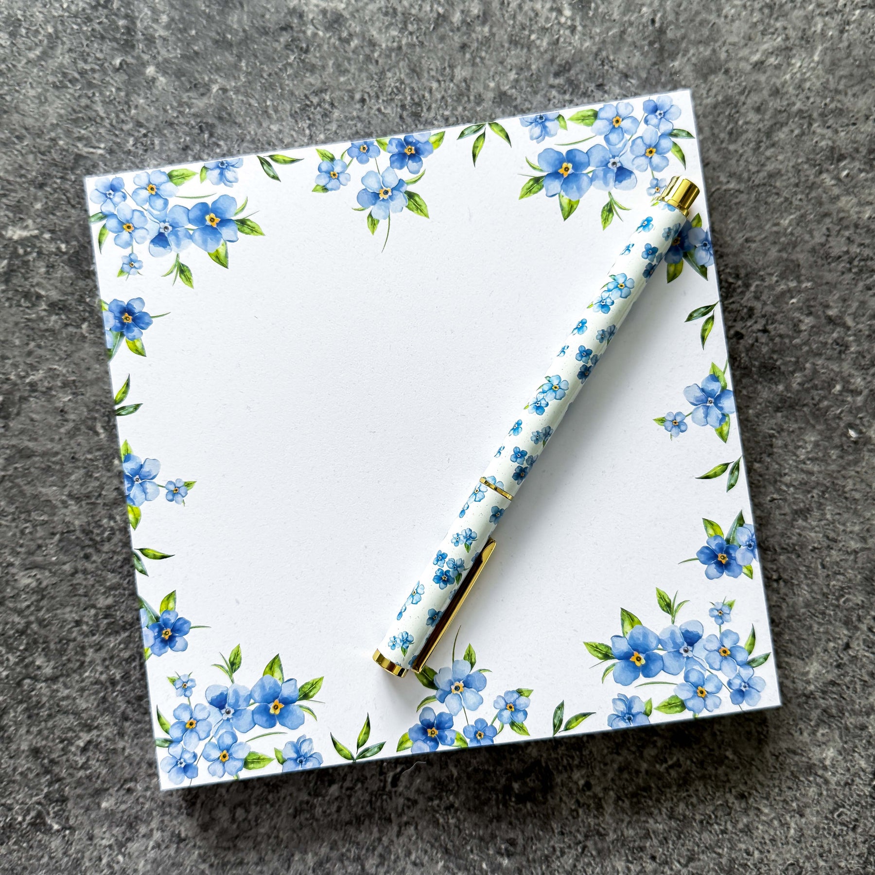 Make notes in style with our Forget-Me-Not Square Notepad. Includes 100 sheets, perfect for your thoughts, a sweet backpack note, or to purchase as a gift for a loved one!