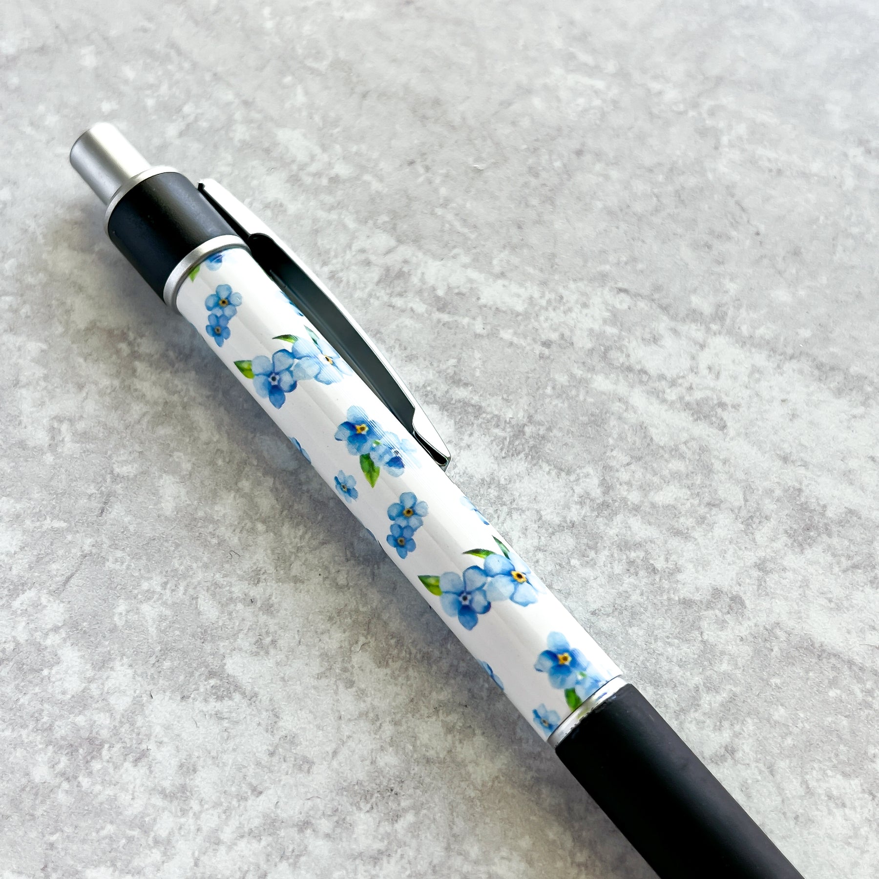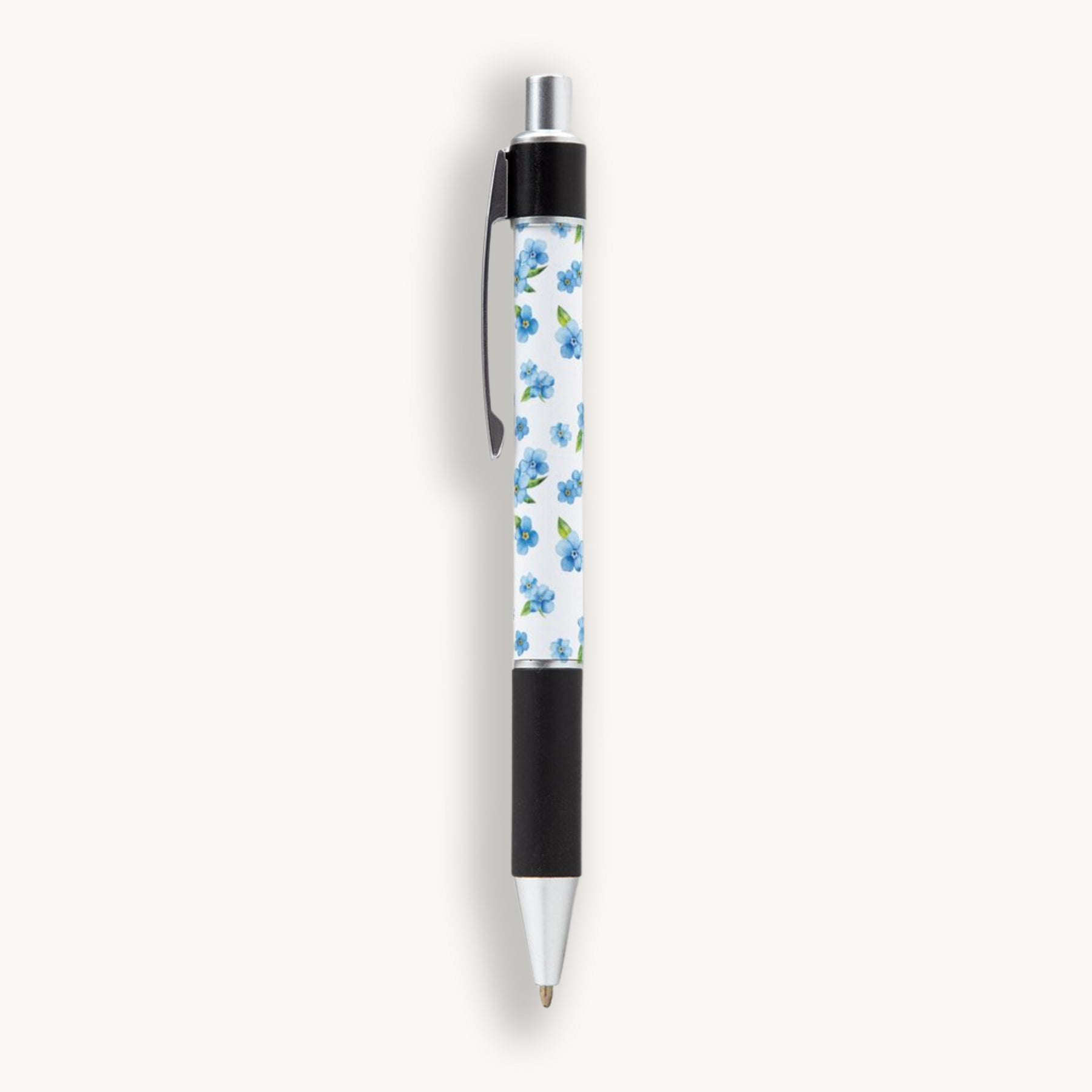 Our beautiful Forget-Me-Not Pen is the perfect companion for your Simpliday Paper notebooks and notepads and a staple for your desk or purse. This premium ballpoint pen features Simpliday Paper artwork that wraps entirely around the pen.