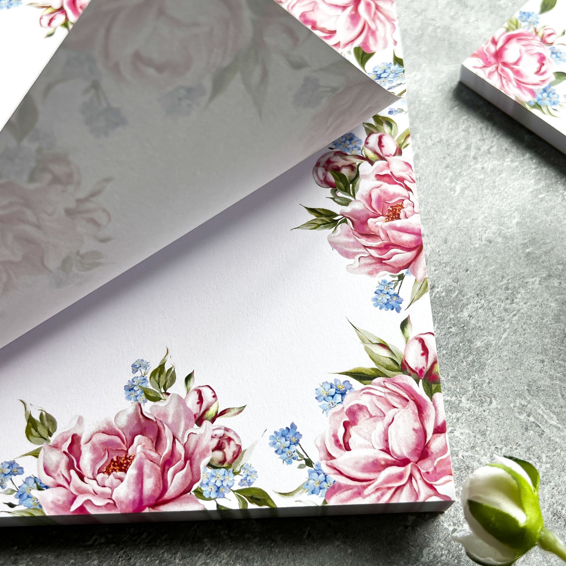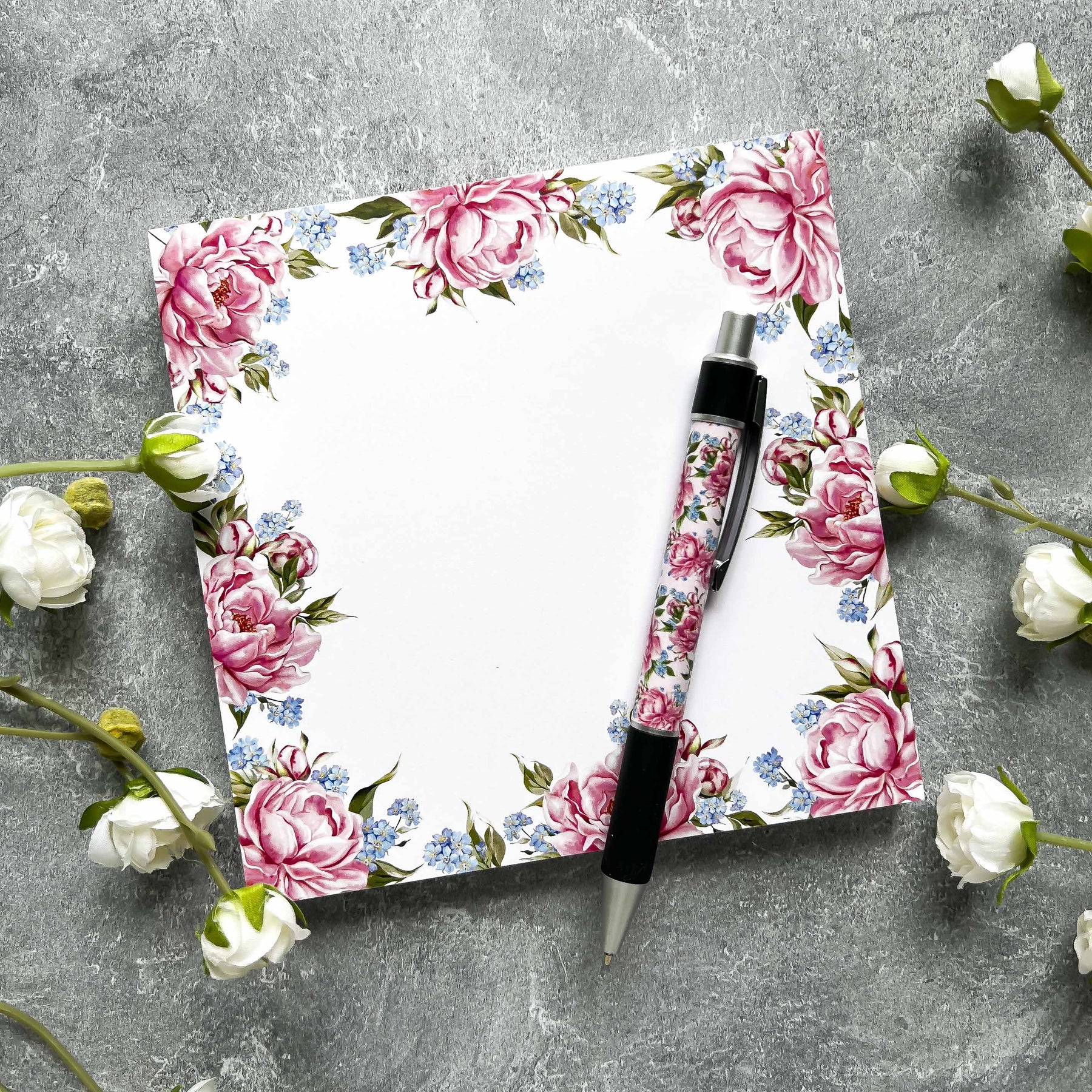 Make notes in style with our Pink Peony and Forget-Me-Not Square Notepad. Includes 100 sheets, perfect for your thoughts, a sweet backpack note, or to purchase as a gift for a loved one!