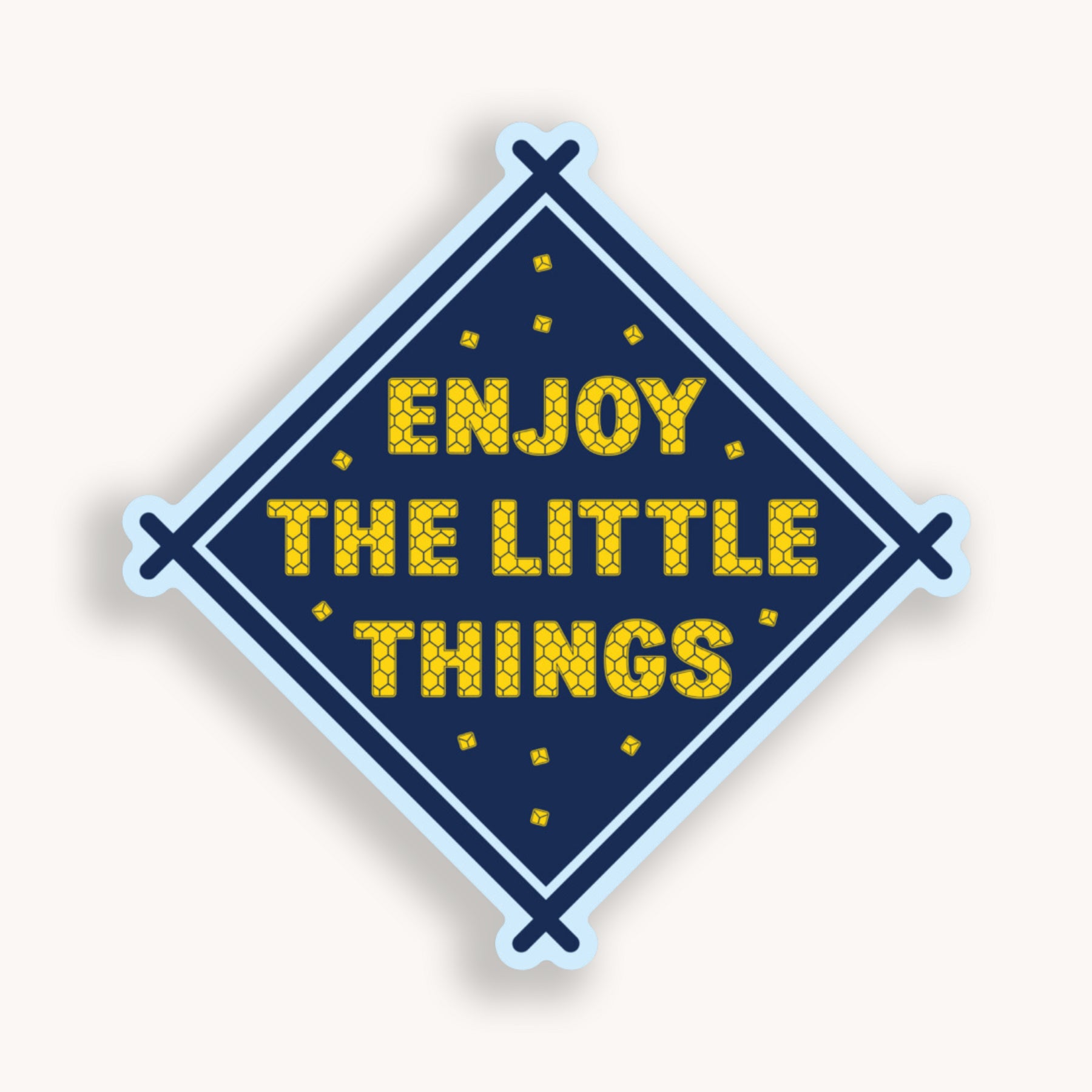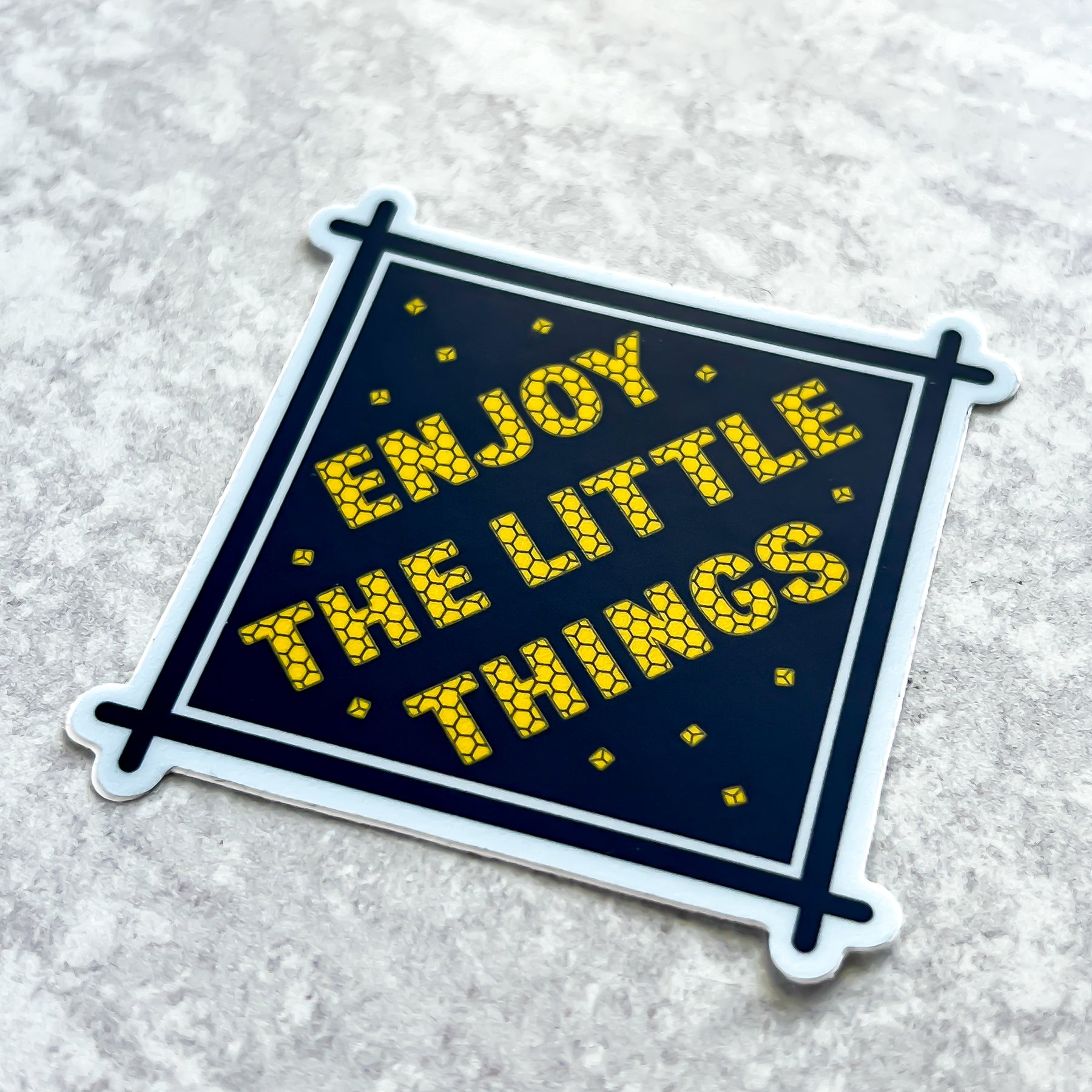 Navy and yellow Enjoy the Little things die cut vinyl sticker comes with a solid white backing. Can be used on mobile phones, water bottles, cups, binders, notebooks and more.