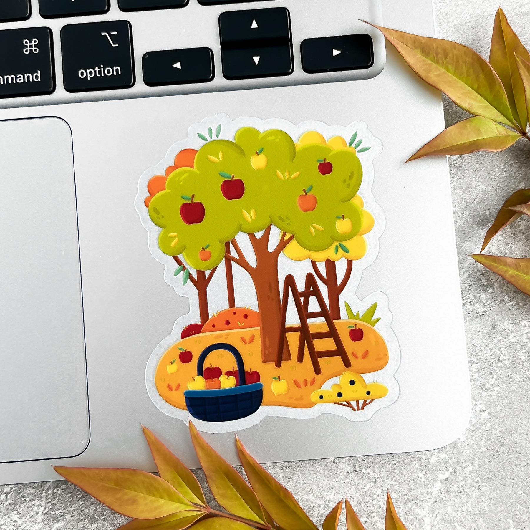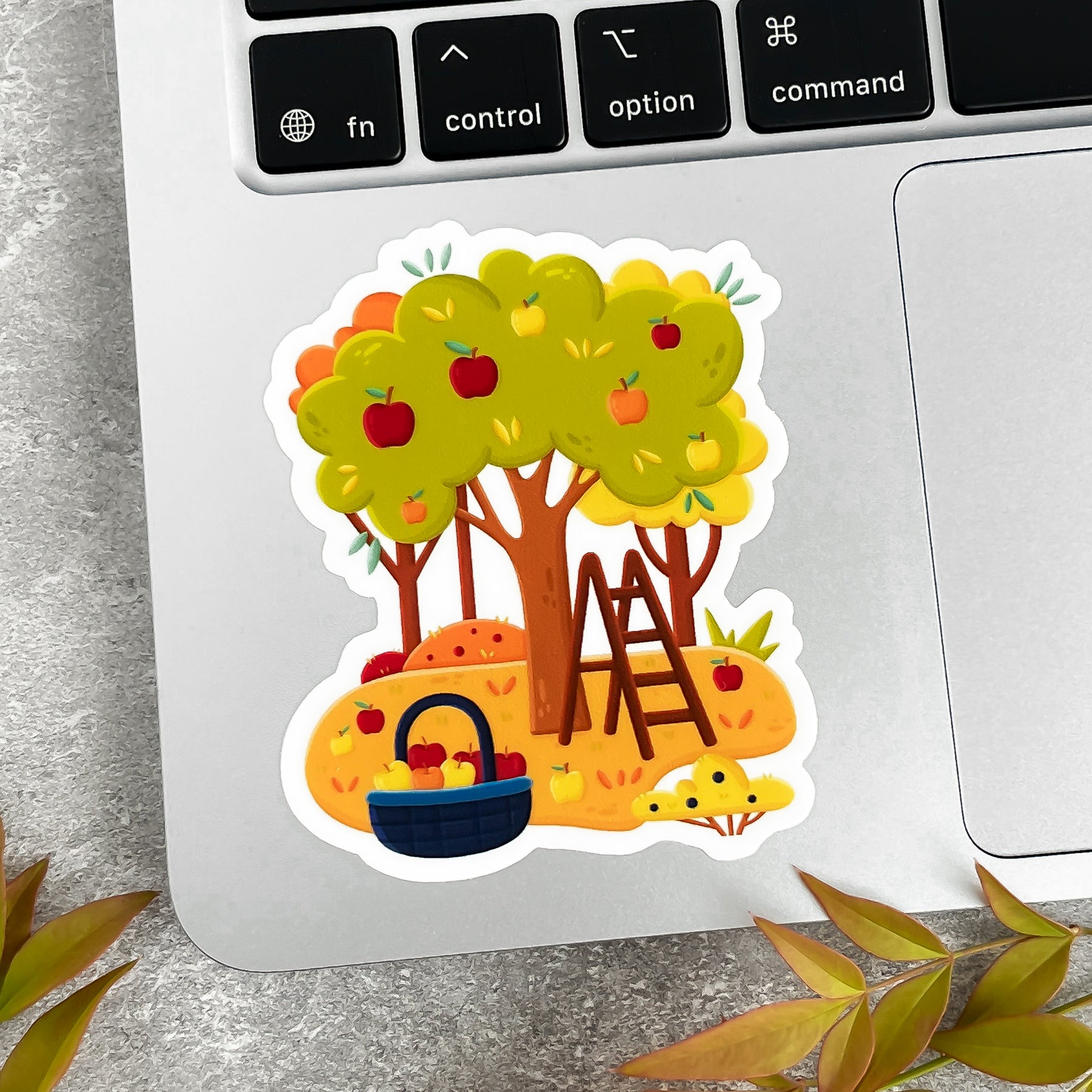 Sticker of a tree with apples, a basket, and a ladder on a laptop keyboard.