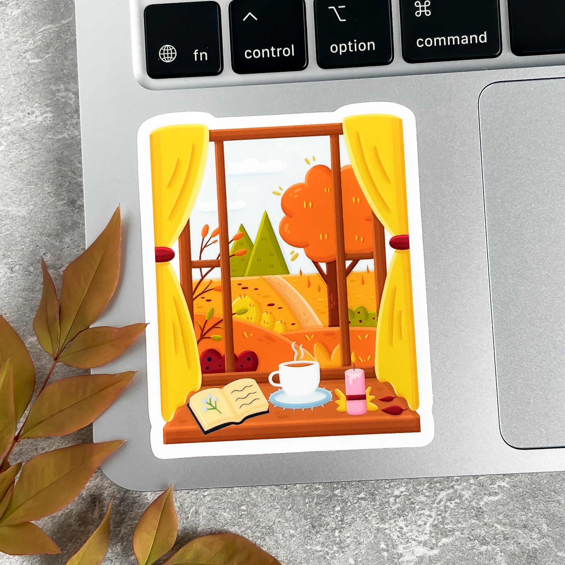 Autumn window view vinyl sticker offered in classic white with white background and white border once the backing is removed, or clear sticker with a solid white backing, but is clear once the backing is removed. Can be used on mobile phones, water bottles, cups, binders, notebooks and more.