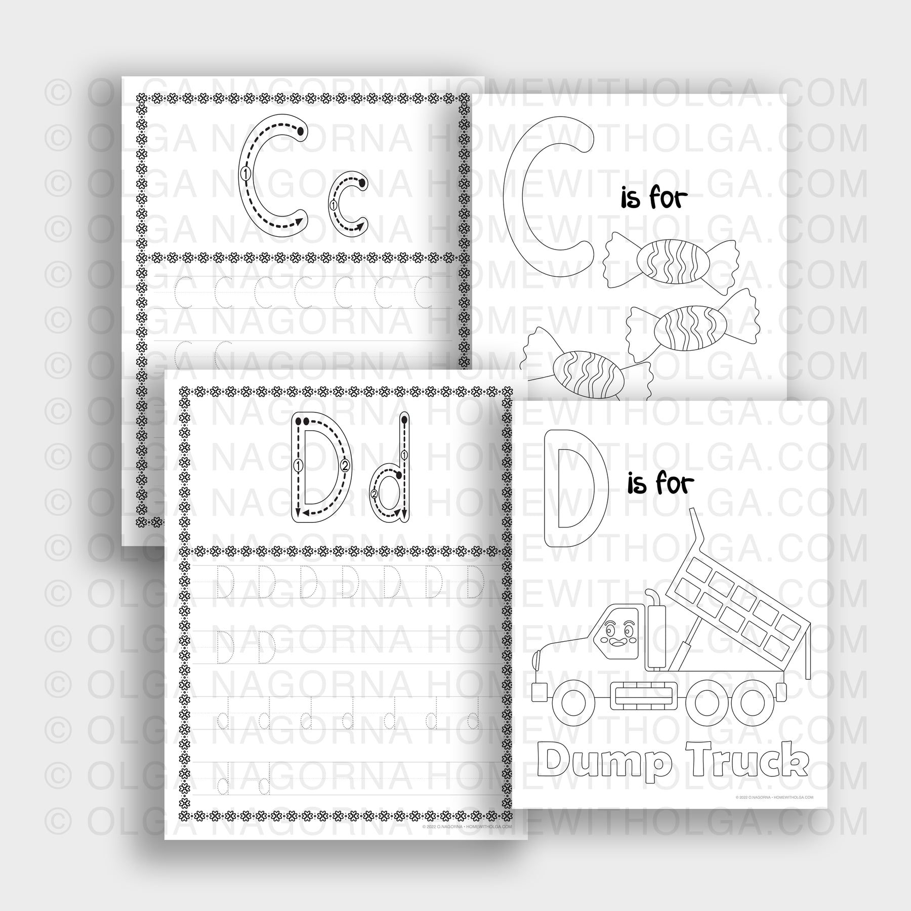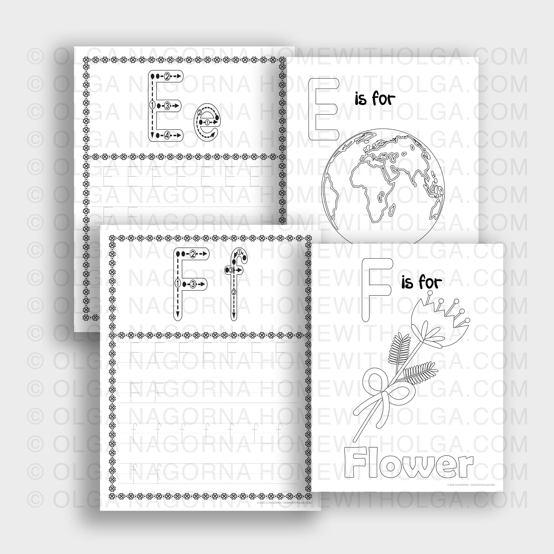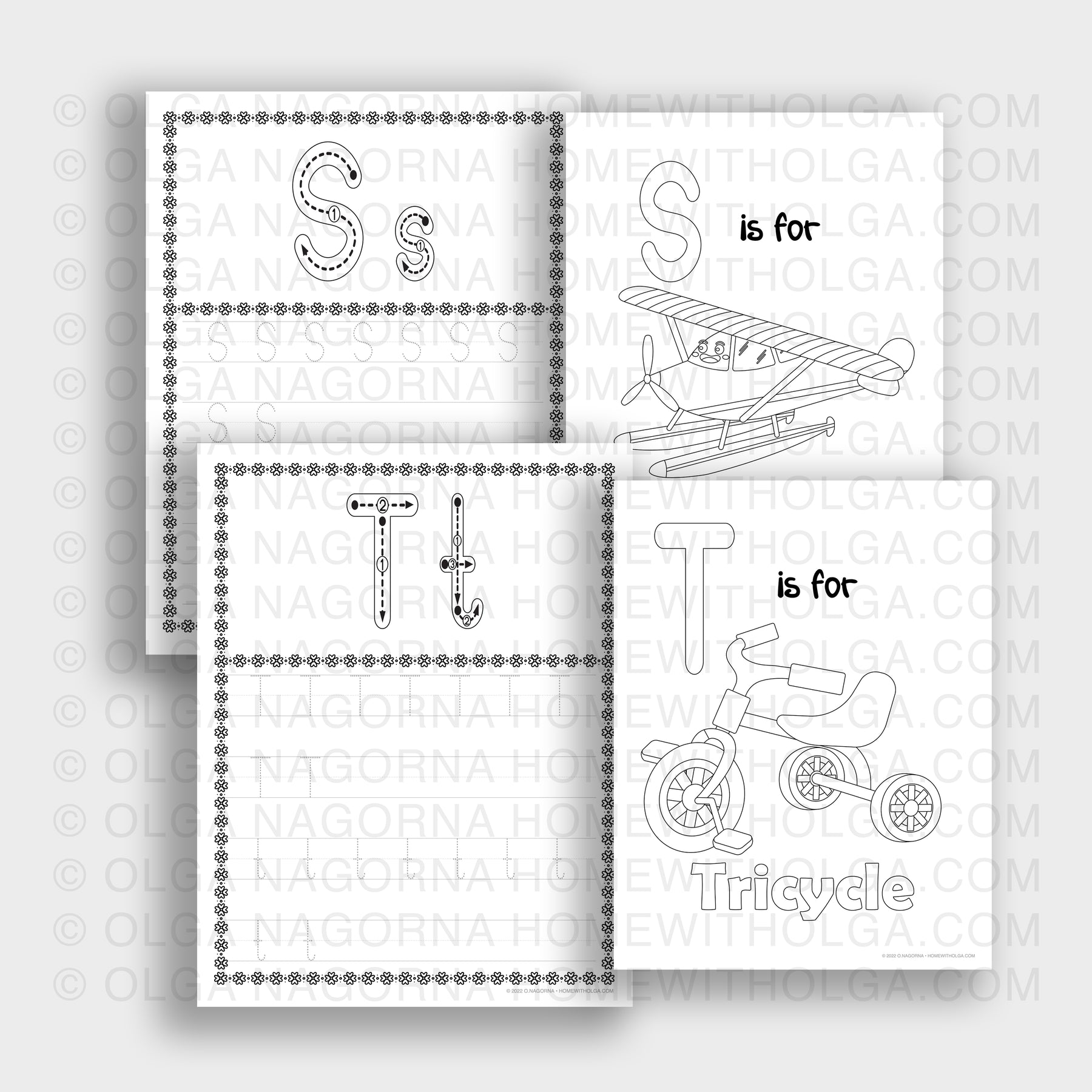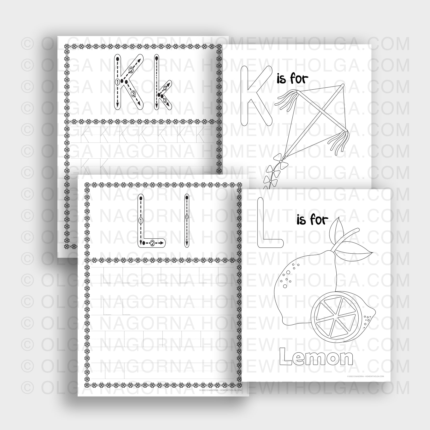 A set of full English alphabet tracing. Each letter comes with a coloring page that goes with each letter.