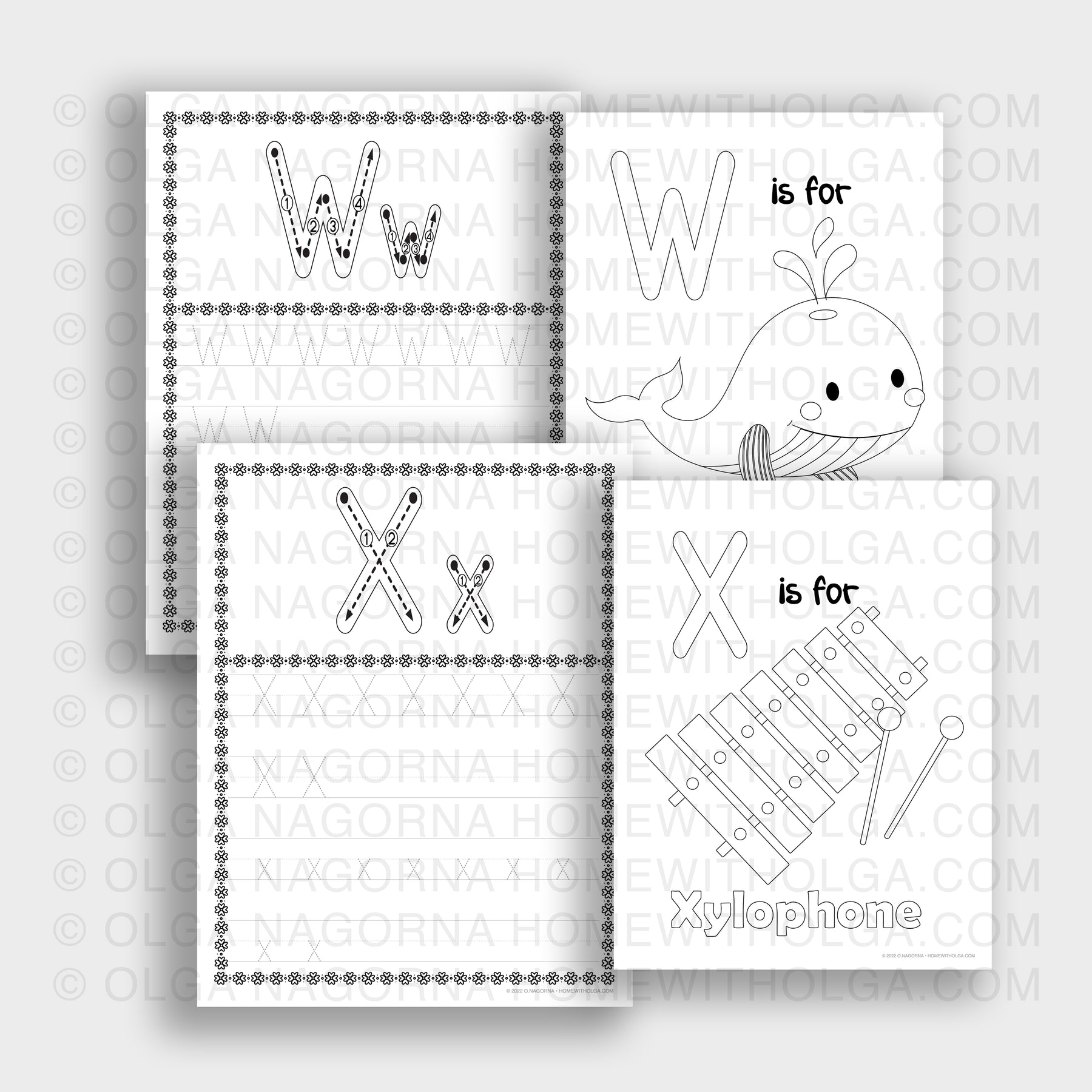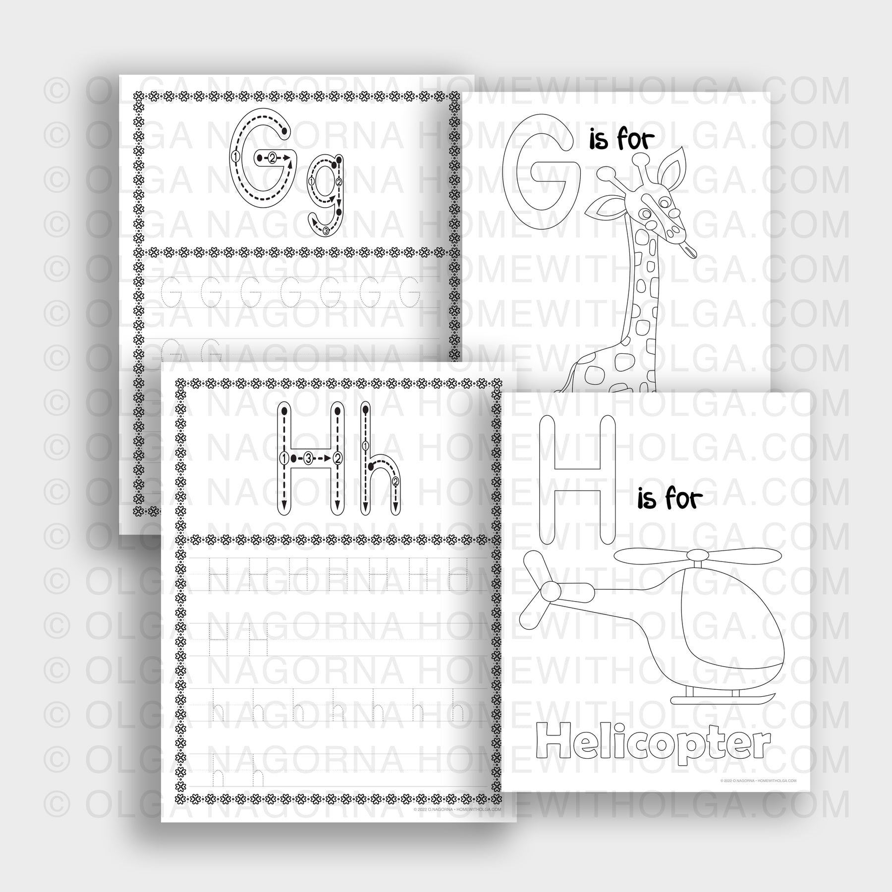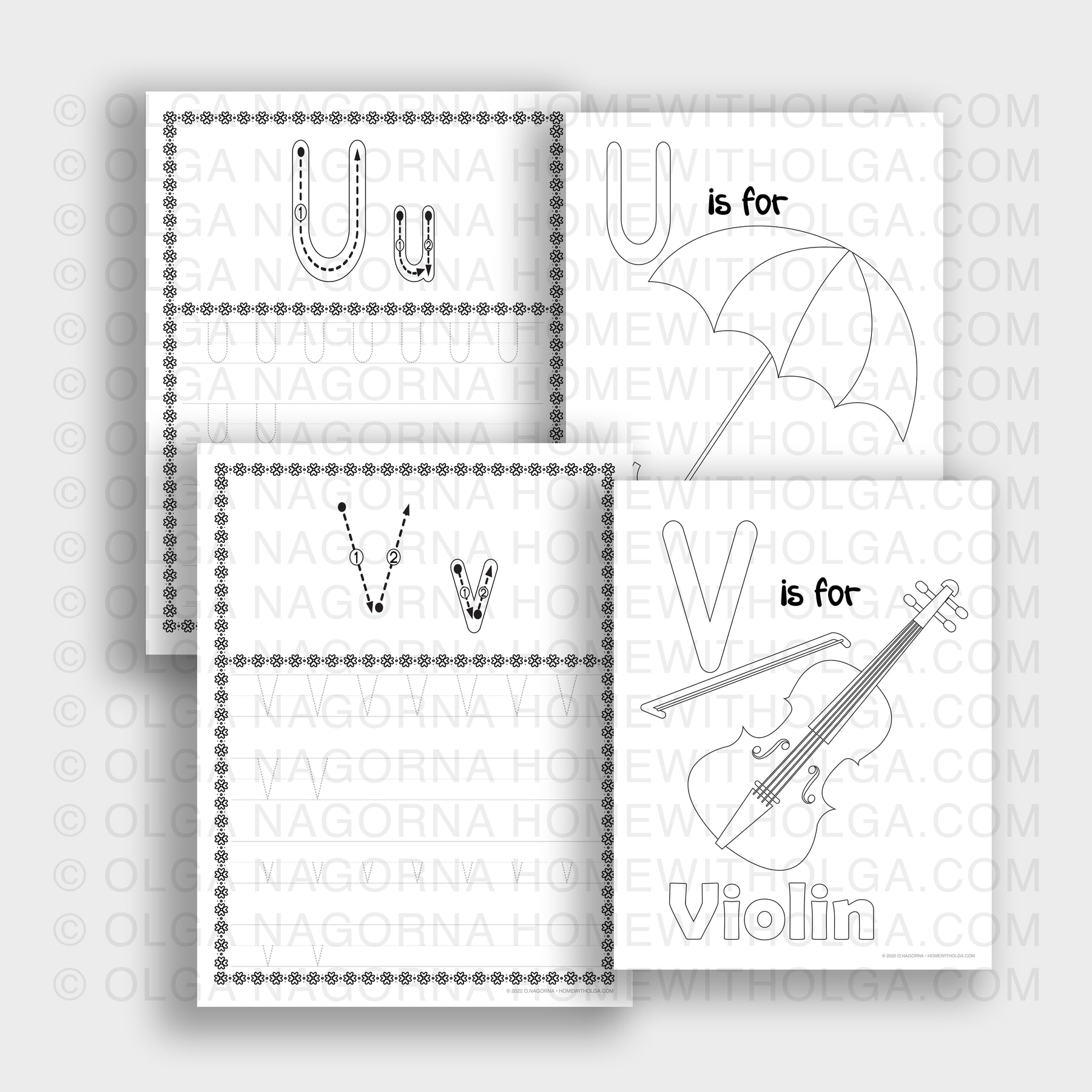 A set of full English alphabet tracing. Each letter comes with a coloring page that goes with each letter.